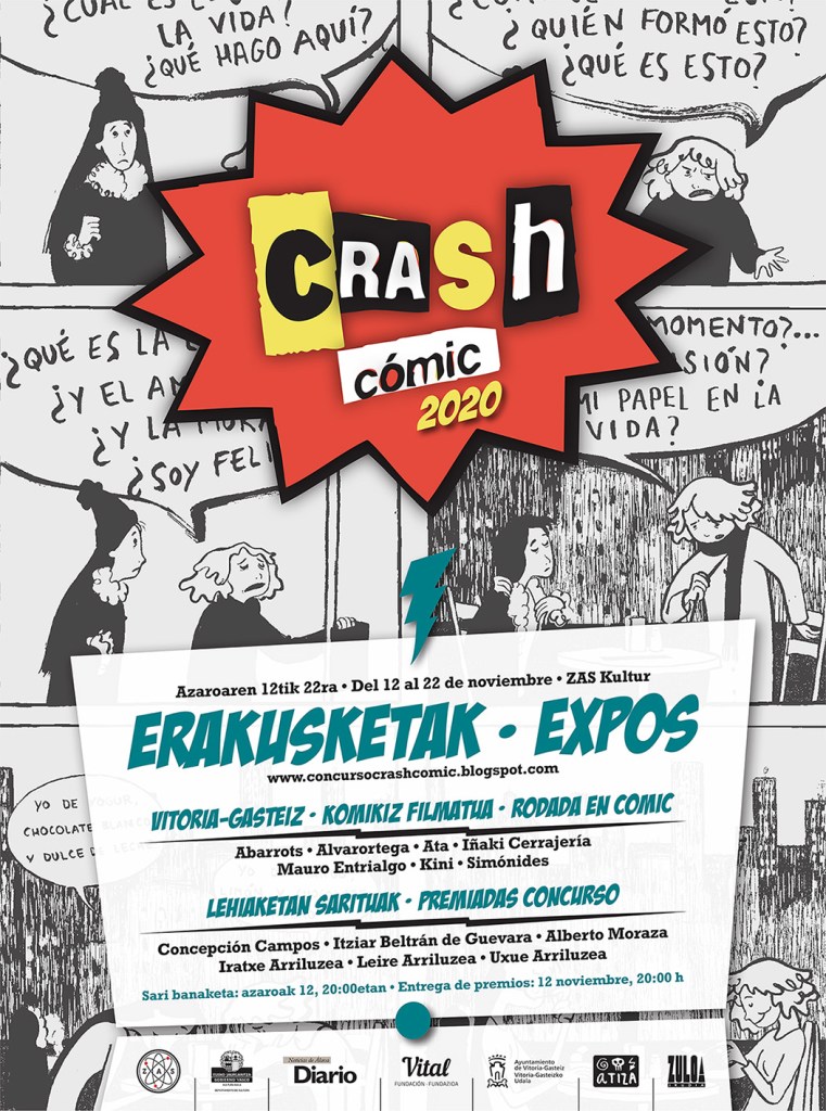 Desde hace tres años “Crash” cuenta con el apoyo de nuestro Ayuntamiento, de la Fundación Vital, del Diario de Noticias de Álava, del espacio cultural Zas y del TMEO. Como en ediciones anteriores, Atiza convocó en octubre bajo ese paraguas su certamen de cómic para jóvenes alaveses. Pudieron participar en él personas que estudiasen o residieran en Álava bajo dos modalidades de acuerdo a criterios de edad: la primera para los más jóvenes (de 12 a 17 años) y la segunda para personas de 18 a 35 años. Las personas premiadas han sido las siguientes: