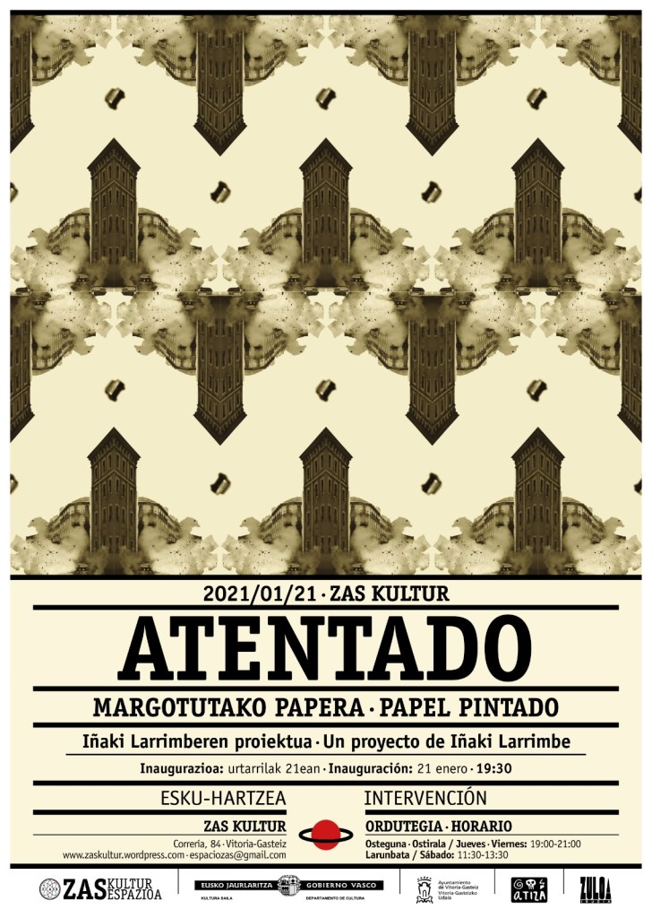 Larrimbe empapela con su tercer papel pintado sobre los iconos de la Transición las paredes de Zas Kultur. Una vez más el artista nos incita a reflexionar sobre el propio medio artístico, cuestionando su propio soporte. Pero no sobre el que se realiza la obra, sino sobre el que la obra suele ser colgada; es decir, la pared. El papel pintado sigue un patrón que se expande por el espacio. Una repetición de ornamentos y motivos que componen un espacio de equilibrio compositivo. Entre la aparente inocencia de los mismos, surgen las siempre presentes imágenes icónicas de la transición. La estrategia se abre entonces hacia diferentes caminos. Por un lado, subyace una reivindicación de un arte que salta de la pieza única para convertirse en un material barato y seriado. Por otro, un alegato contra la irrupción de lo político en nuestra cotidianidad, siendo capaz de ocupar un espacio de intimidad (el hogar) y la supuesta inocuidad de aquellos objetos que nos acompañan en nuestra rutina. En esta ocasión «Atentado» toma como motivo icónico central sobre el que se construye el ornamento del papel pintado la imagen del asesinato de Carrero Blanco.