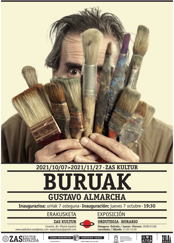 «Buruak» (Cabezas) es una exposición individual del artista afincado en Gasteiz Gustavo Almarcha comisariada por Zas Kultur. «Buruak» es también el título del documental homónimo del realizador alavés Aitor López de Aberásturi. Cortometraje que se proyectará la semana siguiente en el mismo espacio en el que se despliega la muestra: Zas Kultur. El propio documentalista acudirá a este espacio cultural ubicado en el corazón de la Almendra para comentar todos los pormenores de este intenso trabajo que ha sido premiado en diversos festivales y que versa sobre la vida y obra del Almarcha.