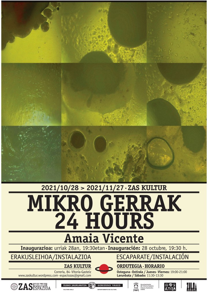 Se trata de una instalación con proyección sobre el escaparate de la sede de Zas Kultur de la artista Amaia Vicente que lleva por titulo MIKRO GERRAK 24 HOURS que se articula partiendo de la imagen generada a través de un microscopio.