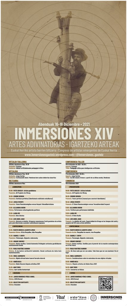 En su XIV edición, Inmersiones pretende acercarse al territorio en el que el arte y la predicción, trabajando como engranajes de diferentes conocimientos, nos ofrecen la posibilidad de tránsito entre el pasado y el futuro. Se trata de establecer pasarelas de imaginación y conexiones audaces entre las ficciones que nos proporciona la historia y las incertidumbres que nos depara el presente.
