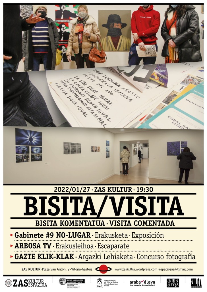 En segundo lugar se realizará una visita guiada a la muestra colectiva de medio centenar de artistas cercanas/os “Gabinete Zas #09 No lugar”. Participantes: Alba Tojo, Alberto Lomas y Fausto Grossi, Alejandra Bueno, Alejandra Felipe, Amaia Vicente, Anabel García, Anabel Quincoces, Arrate Remón, Arturo / fito Rodríguez, Bildotsne Arrizabalaga, David Brandon, David Guerrero, Donca, Dorleta Ortiz de Elguea, Fernando Gil, Fernando Iglesias, Gerardo Armesto, Gert Voor Int Holt, Gustavo Almarcha, Igor Agirre, Ibon Saez de Olazagoitia, Iñaki Cubo, Iñaki Larrimbe, Izaskun Viteri, Javier Merino/Cmkrtist, Javier Reparaz, Joaquín Lara, Jorge Salvador, Josean Pablos, Josune Rodríguez, Juan Aizpitarte, Francisco Berreteaga y Espacio Réflex, Maite Pinto, Mary Zurbano, Marta Ortega, Mel Arranz, Mikel de Kintana, Natxo Rodríguez, Neftalí Campo, Nerea Lekuona, Nuria Pérez-Cárcamo, Ramón Churruca, Roció López, Rubén Beca, Rubén Díaz de Corcuera, Saioa Olmo, Santi Frikuno, Sílvia Diez, Simónides, Vega García, Virginia Lekuona, Zirika.Finalmente, a la selección de jóvenes que han presentado sus propuestas video y fotográficas a la iniciativa “Gazte Klik Klak” bajo la temática “Utopía” y que se cierra al público este mismo jueves. Participantes: Ane Galindo, Ania Rio, Beñat Gorostidi, Guillermo Quesada, José Martínez, June Aburto, Laura García, Mario Lezaun, Óscar Golpe, Patricia Laiseka.
