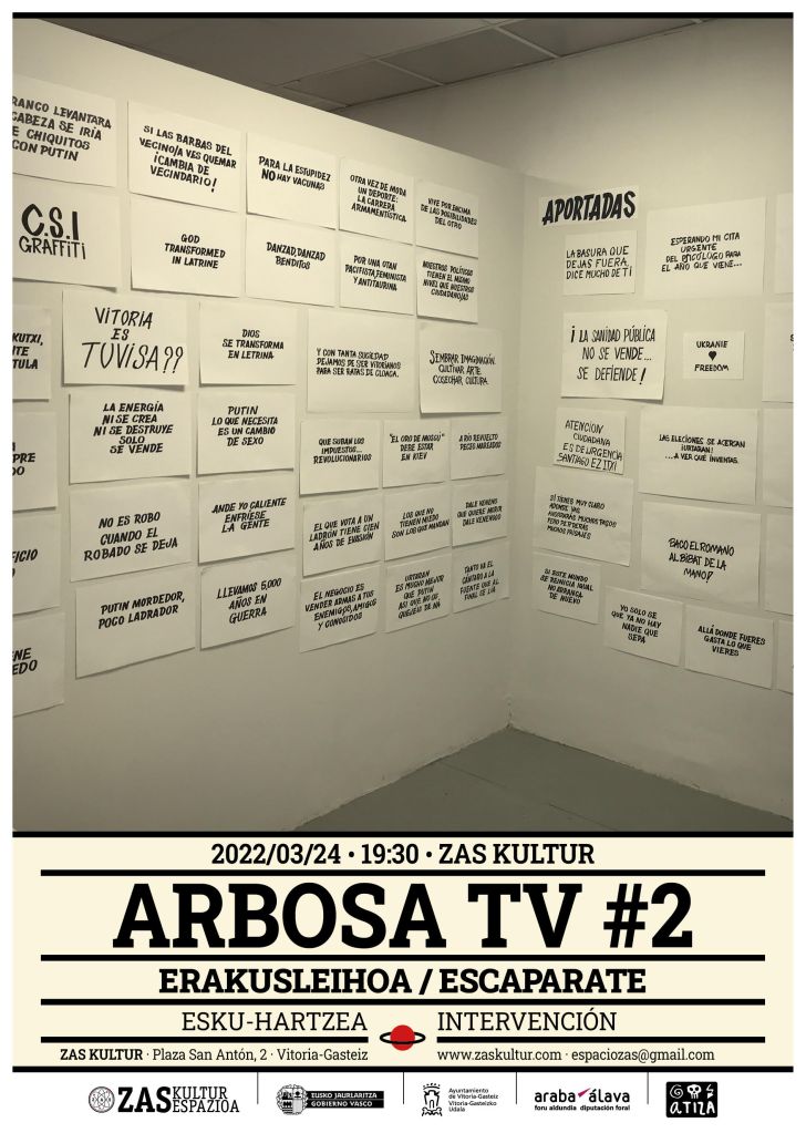 📺 Este jueves 24 de marzo a las 19:30, Zas Kultur inaugura una nueva propuesta artística en el escaparate de su sede situada en la Plaza de San Antón. De título “Arbosa TV#2”, se trata de una intervención colectiva que sigue el surco, la estela, del peculiar trabajo del ya fallecido artesano vitoriano Julio Arbosa. Recordemos que el polifacético creador durante los años 80 y 90 escribía diariamente mensajes sobre la pantalla de una televisión situada en el escaparate de su taller. Mensajes de actualidad, de carácter crítico, pensados para que los paseantes pudieran leerlos. Una selección de ellos pudieron ser vistos también en Zas Kultur bajo el título “Arbosa TV”. Pero ahora, en esta segunda parte dedicada a poner en valor la labor de Julio, los mensajes han sido aportados por las personas asistentes a los talleres de rotulación y pensamiento que se realizaron el mes pasado en este espacio cultural. Estos mensajes irán cambiando diariamente a los largo de los dos meses que va a durar esta iniciativa.