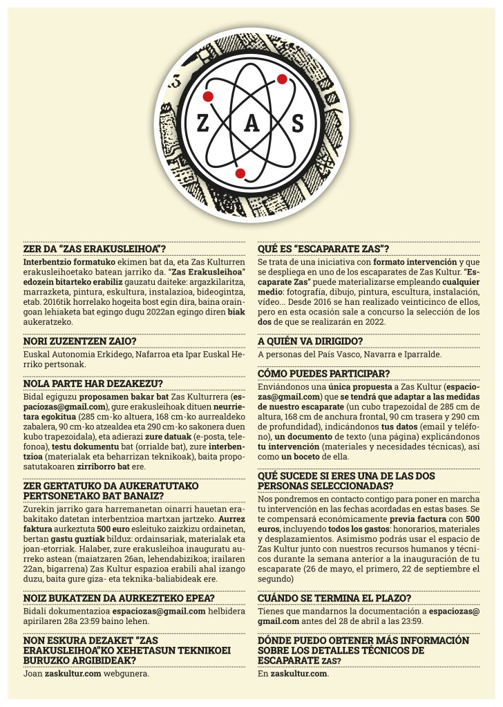 NON ESKURA DEZAKET “ZAS ERAKUSLEIHOA”KO XEHETASUN TEKNIKOEI BURUZKO ARGIBIDEAK? https://zaskultur.com/2022/03/26/convocatoria-escaparate-zas-erakusleihoaren-deialdia/