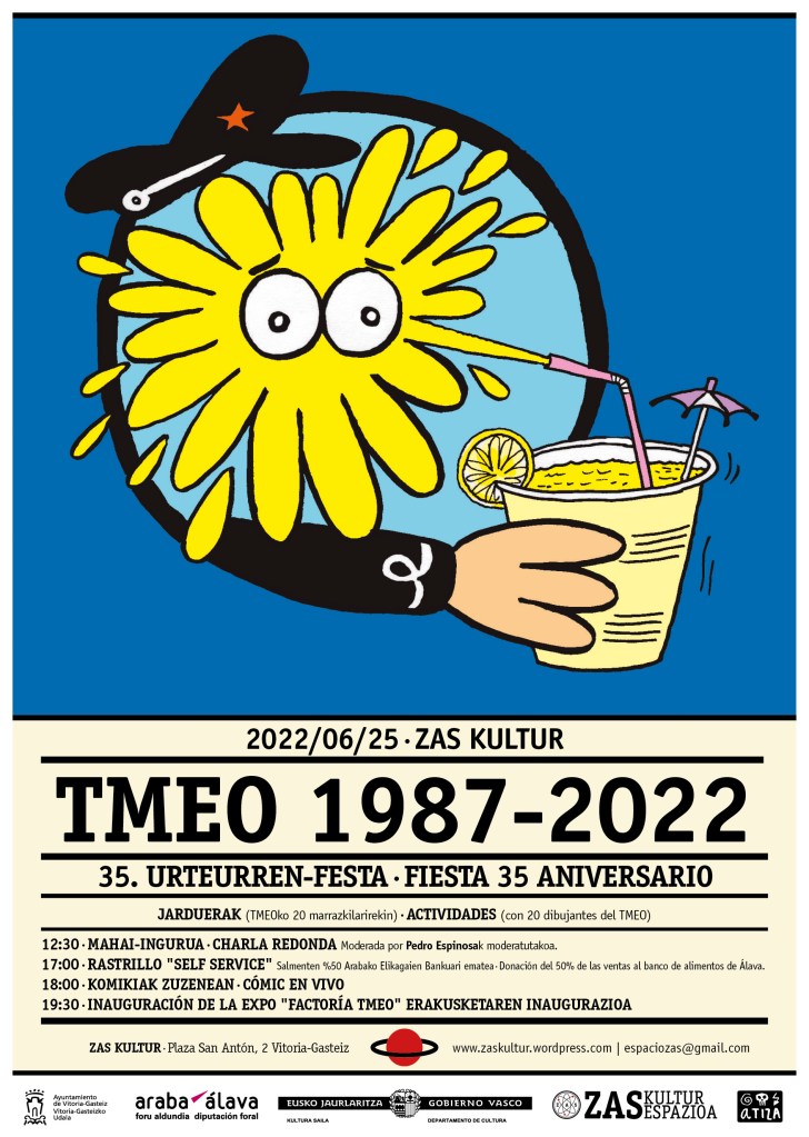 El TMEO, la revista asamblearia de cómic satírico con sede en Gasteiz, cumple este verano su trigésimo quinto aniversario. Para celebrar la anomalía de su longeva existencia buena parte de sus dibujantes se reúne en Zas Kultur presentándonos un buen menú de actividades, aunque el gastronómico se lo reservan para ellos. Como señalan desde su redacción: «Celebramos nuestro aniversario como siempre, a lo vasco: papeando y chupando. Pero además, para no estar todo el sábado dándole al drinking, tendremos a los dibujantes con las manos ocupadas en otros menesteres: vamos a realizar alguna cosilla para entrenerles y entretener a los que quieran acercarse. La gente de Zas de Gasteiz nos cede el espacio para ello. Todo un lujo porque tienen sillas, mesas, retretes, cafetera, un botiquín…»