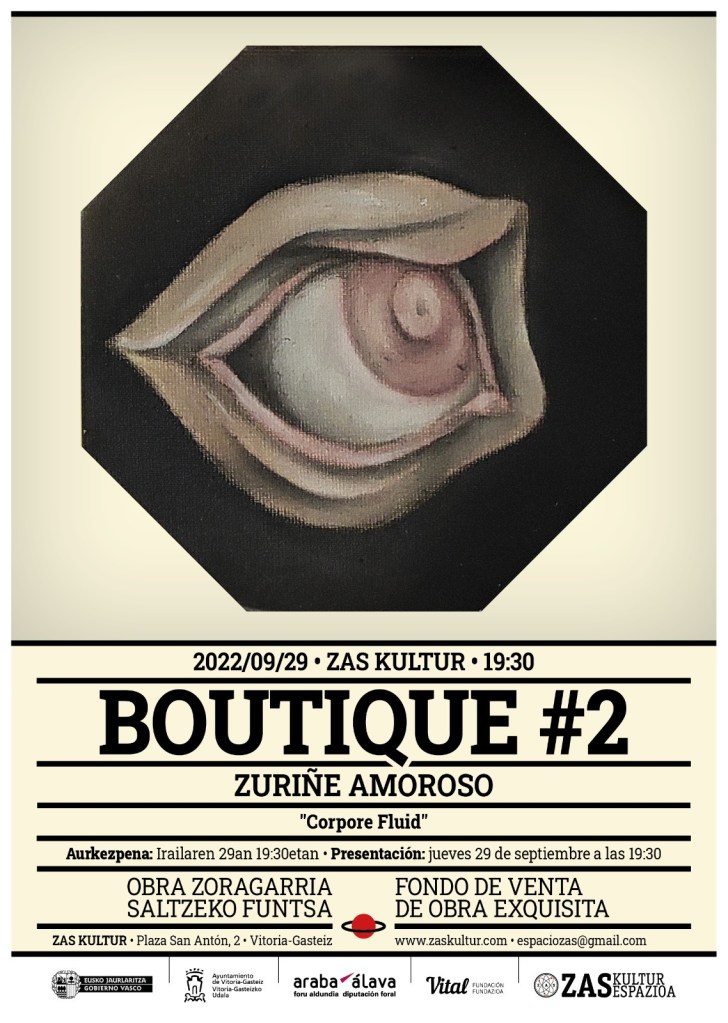 “La Boutique” es un proyecto que muta, crece, se puso en marcha con el objetivo de visibilizar el trabajo de las/los artistas «kilómetro 0» e incentivar la venta de arte. El proyecto nació para democratizar la adquisición de obras y como respuesta a la escasez de espacios en nuestra ciudad dedicados a la venta de arte contemporáneo. Las obras solo se muestran en solitario para su presentación, puesto que tras un periodo de tiempo pasan a incorporarse al fondo de venta. La selección de obras corre a cargo de Daniel Castillejo, experto en el mundo del arte contemporáneo y ex director del museo ARTIUM. Este jueves a las siete y media de la tarde, nos presenta «Corpore Fluid» de Zuriñe Amoroso.