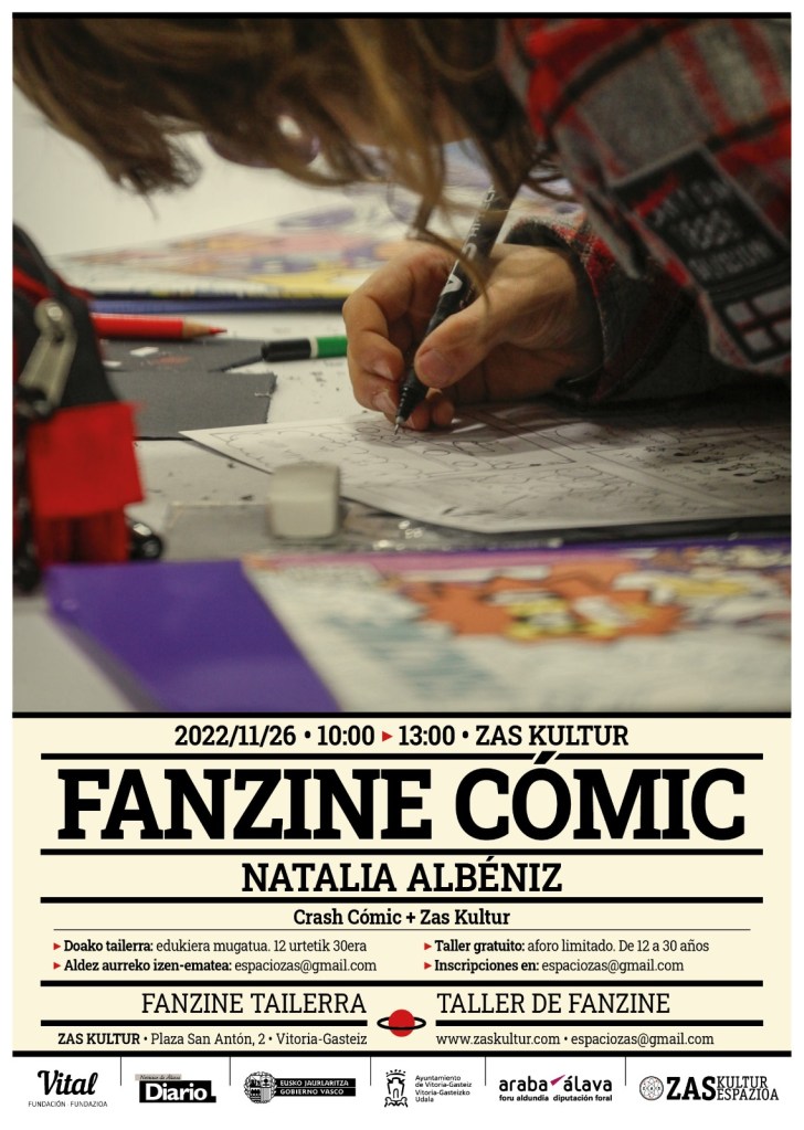 Zas Kultur en colaboración con la Asociación de dibujantes Atiza, pone en marcha un taller práctico y gratuito para la realización de un fanzine de cómics impreso el próximo sábado 26 de noviembre de 10 a 13 horas.