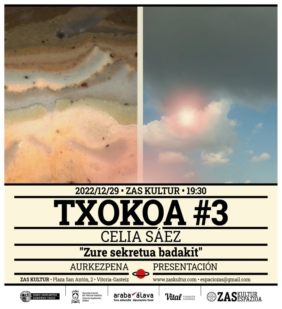 Desde Zas Kultur Espazioa presentamos Zure sekretua badakit de Celia Sáez, tercera seleccionada en la convocatoria “Gaztearen Txokoa”. “El txoko joven” es una herramienta pensada para que los y las jóvenes artistas gasteiztarras puedan generar intervenciones de nuevo cuño en este espacio cultural alternativo vitoriano centrado en las artes visuales contemporáneas. La iniciativa, abierta a cualquier tipo de medio artístico, busca acoger y visibilizar el potencial artístico de los y las creadoras de nuestra ciudad. Con esta finalidad, se cede a las personas seleccionadas y de forma temporal -previo concurso- una pequeña sala expositiva (de ahí el nombre, “txokoa”) para que puedan realizar sus proyectos work in process. Esta iniciativa cuenta con el apoyo del Servicio de Juventud del Ayuntamiento de Vitoria-Gasteiz.