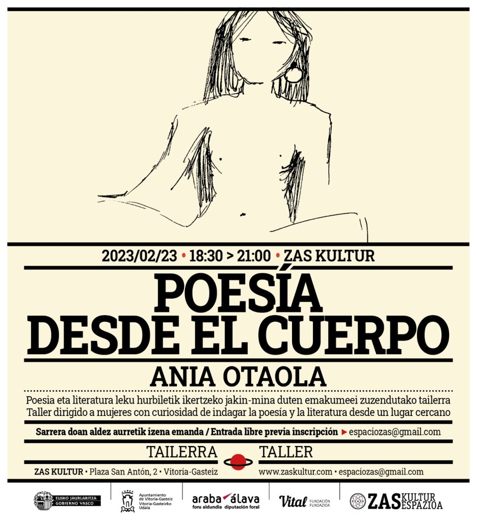 El próximo jueves 23 de febrero entre las 18:30 y 21:00 horas, Ania Otaola impartirá en ZAS su taller Poesía desde el cuerpo. Se trata de una propuesta dirigida a mujeres con curiosidad de indagar la poesía y la literatura desde un lugar cercano, de piel y hueso.