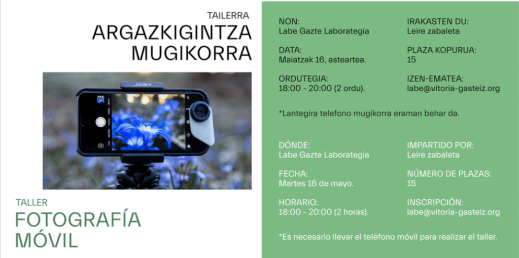 Seguramente has intentado mil veces hacer fotos con tu móvil pero nunca salen como te gustarían, bien porque no salen con la luz adecuada, o el encuadre no parece el correcto, o acaban saliendo un poco borrosas… y acabas pensando que el móvil quizá no sea el mas adecuado para las fotos. ¡Pues no te preocupes! La finalidad de este curso será aprender a sacarle el máximo partido a la cámara del móvil para conseguir mejores resultados en las fotos sin necesidad de contar con una cámara fotográfica de ultimo modelo. Con los consejos y ayuda de la fotógrafa Leire Zabaleta, conceptos como balance de blancos o apertura de ISO se irán haciendo mas familiares durante las dos horas de taller.