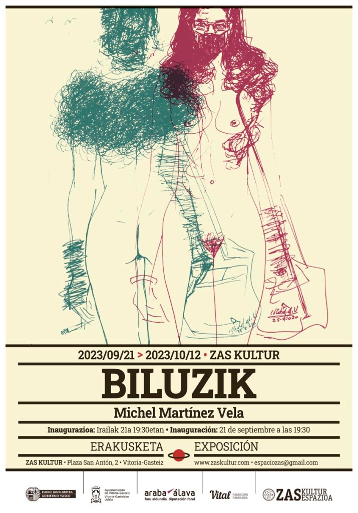 En resumen, «Biluzik» de Michel Martinez Vela es un testimonio de la búsqueda de la autenticidad de nuestros cuerpos. Su obra nos invita a redescubrir y apreciar la verdad en un mundo obsesionado por la apariencia superficial poniendo delante de nuestros ojos, a través del dibujo, nuestra corporeidad escondida.