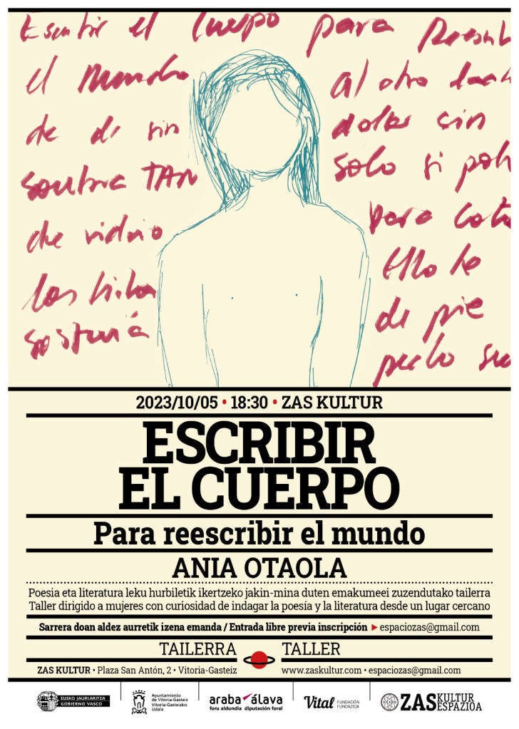 Datorren ostegunean, urriak 5, 18: 30etatik 21: 00etara, Ania Otaolak «Gorputza idatzi mundua berridazteko» tailerra eskainiko du Zas Kulturren (San Anton plaza, 2).