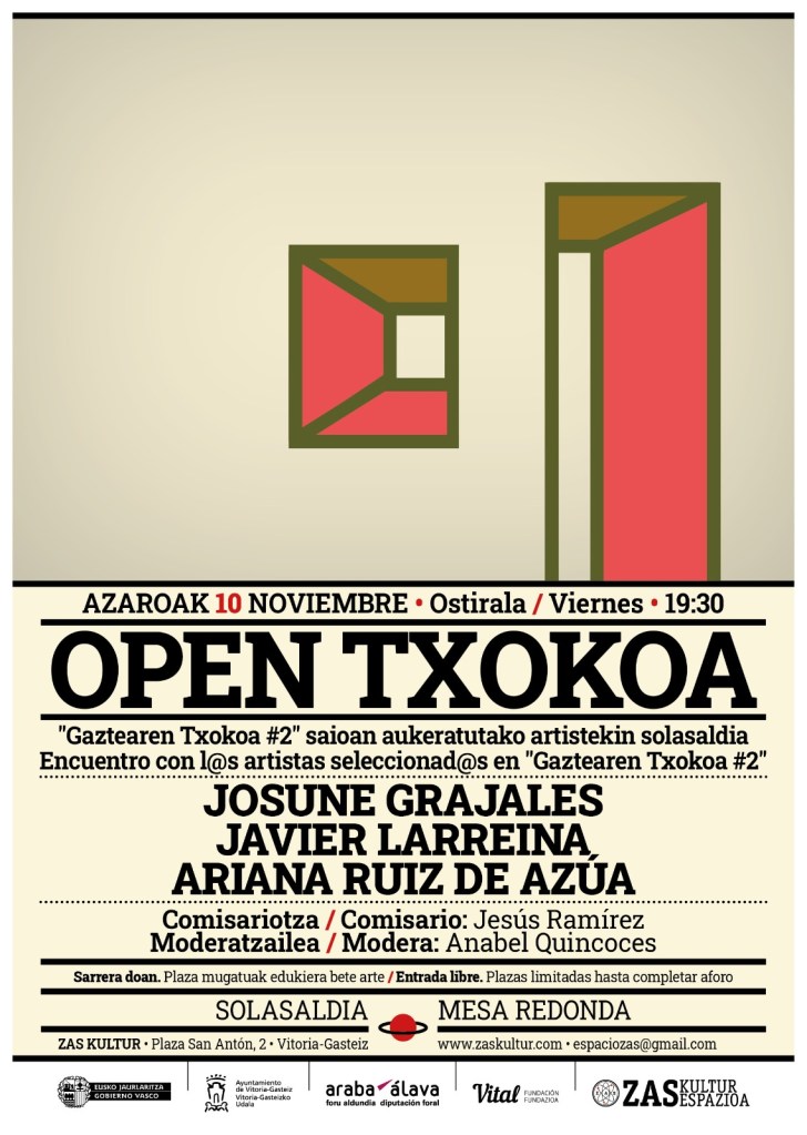 En el encuentro, estos artistas presentarán sus proyectos originales, y avanzarán su proceso creativo. La mesa redonda estará moderada por el comisario de esta iniciativa, el artista Jesús Ramírez, y la comisaria asociada, quien también es una de las artistas seleccionadas, Ariana Ruiz de Azua. Tras la presentación y explicación de los tres proyectos que se desarrollarán en Zas durante los meses de noviembre y diciembre, Anabel Quincoces, artista que actualmente está exponiendo en la exposición colectiva «Lauburu» en Zas Kultur, entrevistará a los tres artistas seleccionados. Esto establecerá un vínculo entre los proyectos «Lauburu» y «Gaztearen Txokoa.»