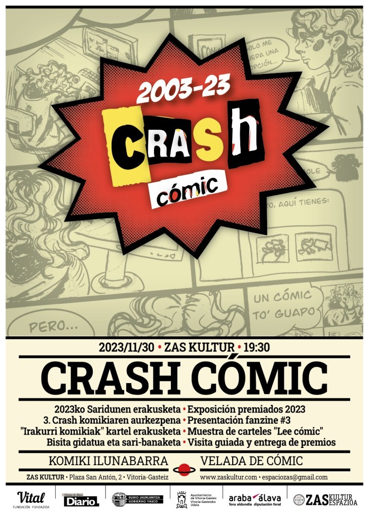 Aurten, «Crash Comic 2023»-k Crash Cómic proiektuaren bi hamarkada ospatuko ditu, Atiza Komiki Marrazkilarien Elkarteak bultzatutako proiektua. Gure lurraldean komikia sustatzea eta babestea izan da bere etengabeko konpromisoa. Hasieratik, Crash Comic Gasteizko kultur egutegian finkatutako urteroko hitzordu bilakatu da, Vital Fundazioaren, Udalaren, Arabako Foru Aldundiaren eta Zas Kultur eta TMEO aldizkarien laguntzari esker.