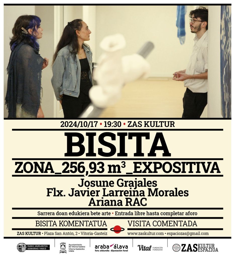 El próximo jueves 17 de octubre a las 19:30, Zas Kultur invita al público a una visita comentada de la exposición Zona_256,93 m3_expositiva. Los artistas Josune Grajales, Flx. Javier Larreina Morales y Ariana RAC, quienes comparten espacio en esta muestra, guiarán al público a través de sus obras.