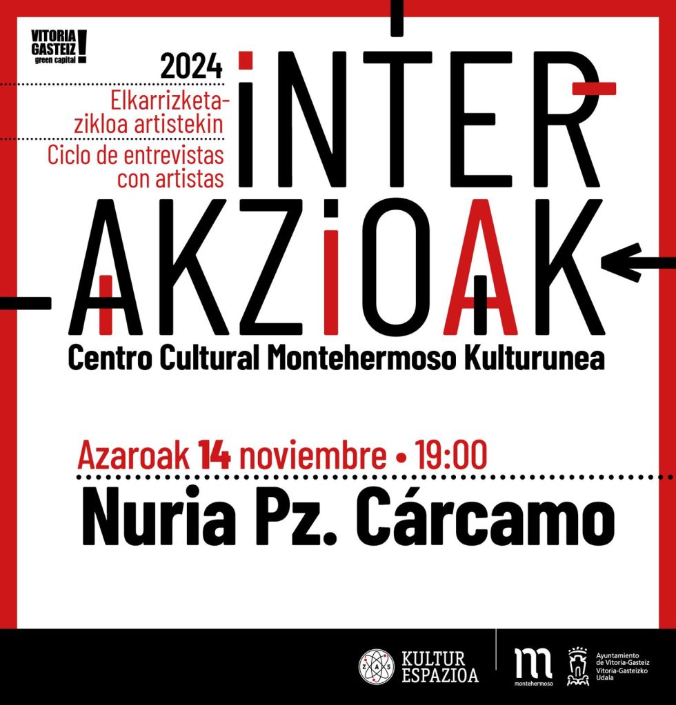 El 14 de noviembre, Zas Kultur en colaboración con el Centro Cultural Montehermoso presenta una nueva sesión del ciclo de entrevistas “Interakzioak/Interacciones”, como parte de la serie «Zas fuera de Zas», una iniciativa que busca acercar el arte contemporáneo al público de Álava en un espacio accesible y cercano. En esta ocasión, la artista Nuria Pérez-Cárcamo será la invitada, quien dialogará con lx artista Ariana RAC, quien moderará la conversación.