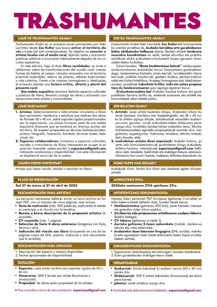 Trashumantes Araba es un proyecto anual comisariado por Iñaki Larrimbe desde Zas Kultur que busca activar el territorio alavés a través del arte contemporáneo. Su objetivo es conectar a artistas locales con el medio rural, tejiendo redes y acercando prácticas artísticas a municipios habitualmente alejados de los circuitos expositivos.