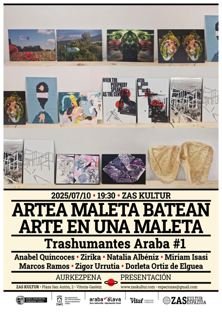 Zas Kultur presenta en su sede las obras que conforman Trashumantes, una exposición colectiva compuesta por trabajos de siete artistas alaveses: Natalia Albeniz, Zirika, Marcos Ramos, Dorleta Ortiz de Elguea, Miriam Isasi, Anabel Quincoces y Zigor Urrutia. Varixs de ellxs acudirán a la presentación para mostrar personalmente sus obras y conversar con el público.