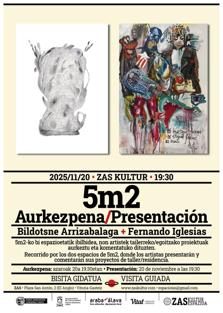 5m² programak prozesu horiek denbora errealean jarraitzea proposatzen du, probak, zuzenketak eta erabakiak Zas Kultur-era hurbiltzen diren pertsonekin partekatuz. Aldi honen aurkezpena azaroaren 20an, ostegunean, 19:30ean izango da Zas Kultur-en (San Antón plaza 2, Anglo auzoa, Gasteiz): 5m²-ren bi espazioei bisita egingo zaie, eta artistek euren abiapuntuak eta lan-esparru hau ulertzeko modua azalduko dituzte. Sarrera doan.