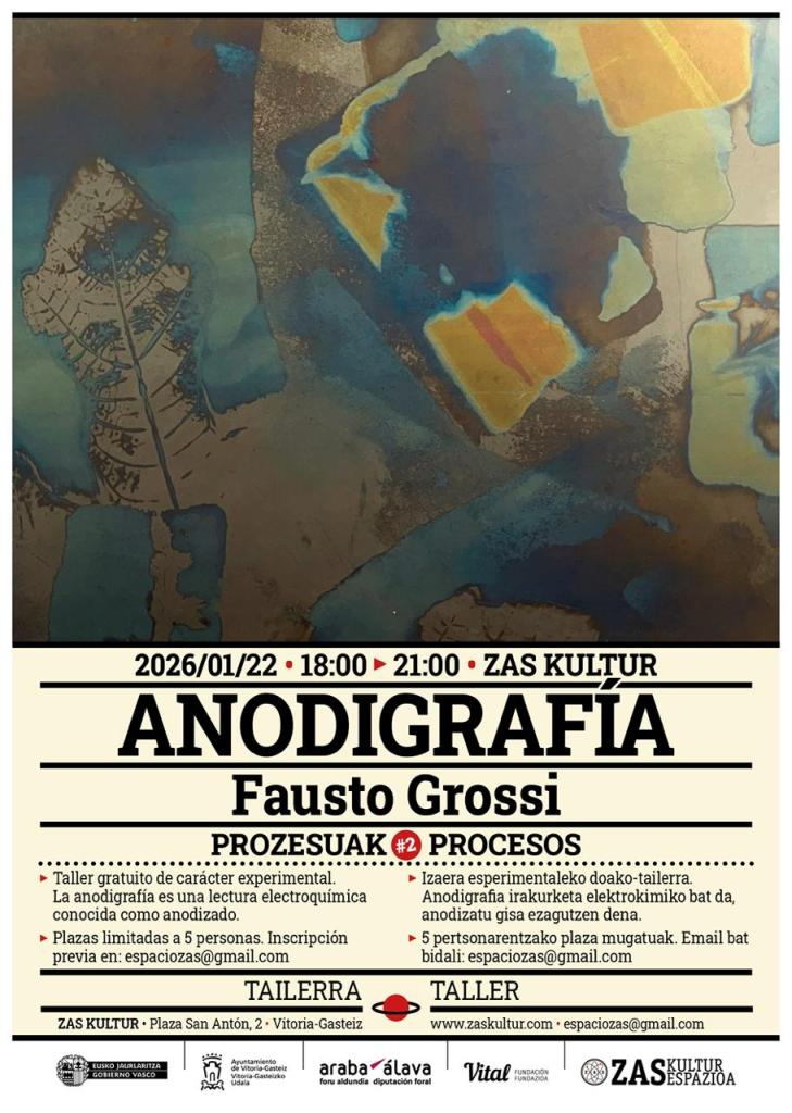 Fausto Grossi artistak, anodigrafiaren sortzaileak, titanioaren anodizazioan oinarritutako idazkera elektrolitikoaren teknikan, anodigrafian, zentratutako tailer bat eskainiko du. Tailerra 2026ko urtarrilaren 22an izango da, 18:00etatik 21:00etara, Zas Kultur gunean, eta plaza mugatuak izango ditu (5 pertsona), beraz, aldez aurretik izena ematea beharrezkoa izango da espaciozas@gmail.com helbidela email bat bidaliz.