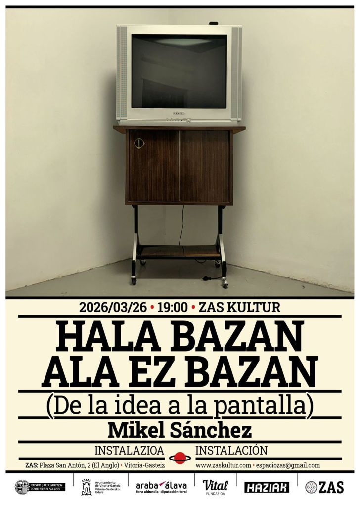 Ostegun honetan, martxoaren 26an, 19:00etan, Zas Kulturrek “Hala bazan ala ez bazan” hartuko du, amaitu gabe dagoen obra bati buruzko instalazioa. Proposamenak Mikel Sanchez Duránek “Jon eta Itsaso” beldurrezko film laburra garatzeko jarraitu dituen prozesuak biltzen ditu.