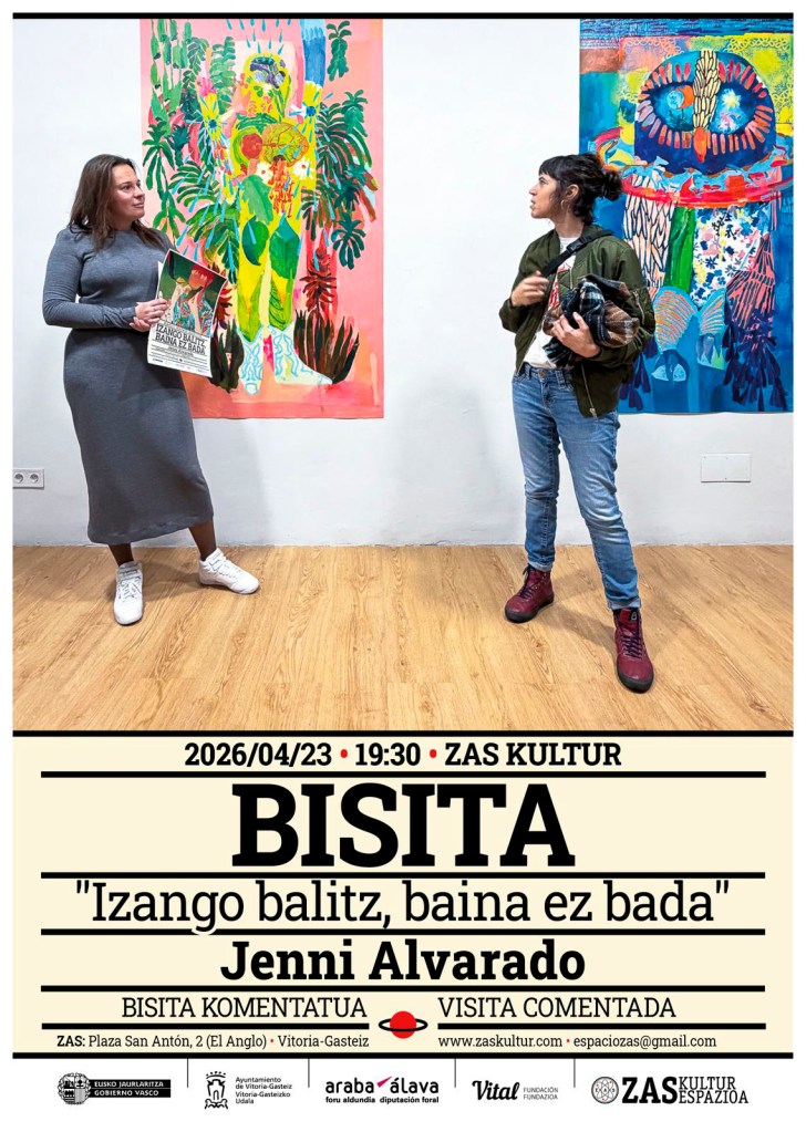 Zas Kultur despliega este jueves 23 de abril una visita comentada con la artista Jenni Alvarado en torno a su exposición «Izango balitz, baina ez bada», que finaliza el sábado 25 de abril. La sesión se plantea como un encuentro de cierre y como una de las últimas ocasiones para recorrer la muestra junto a la autora antes de su clausura.