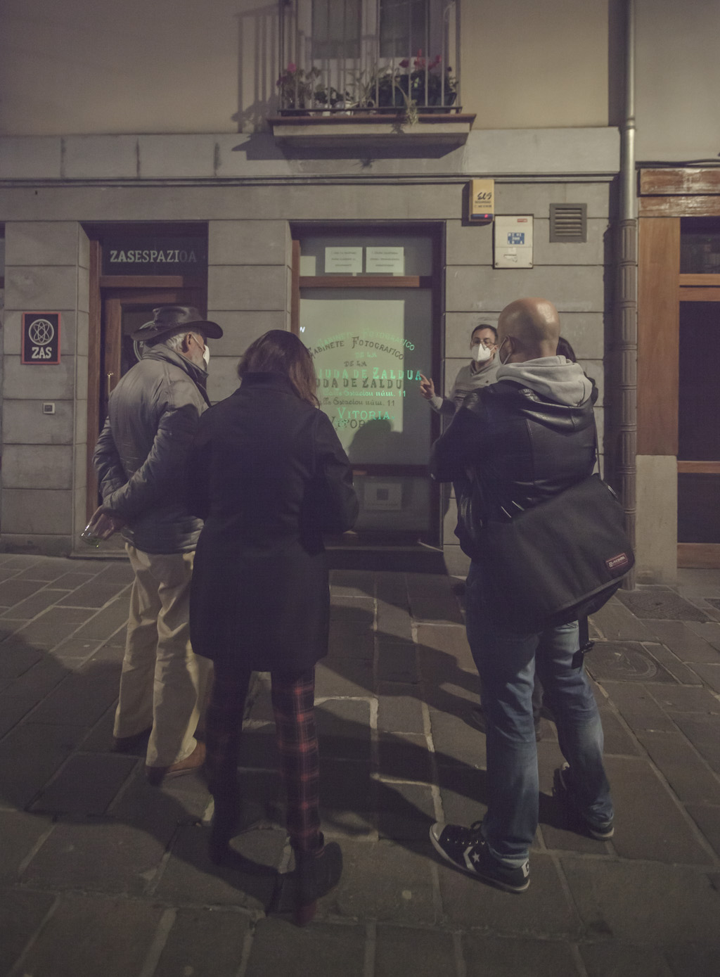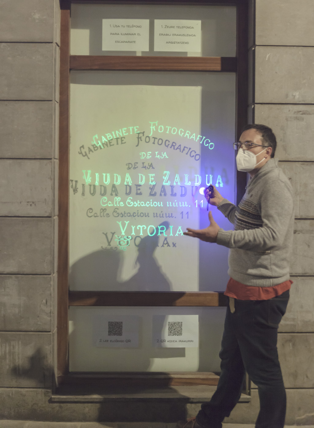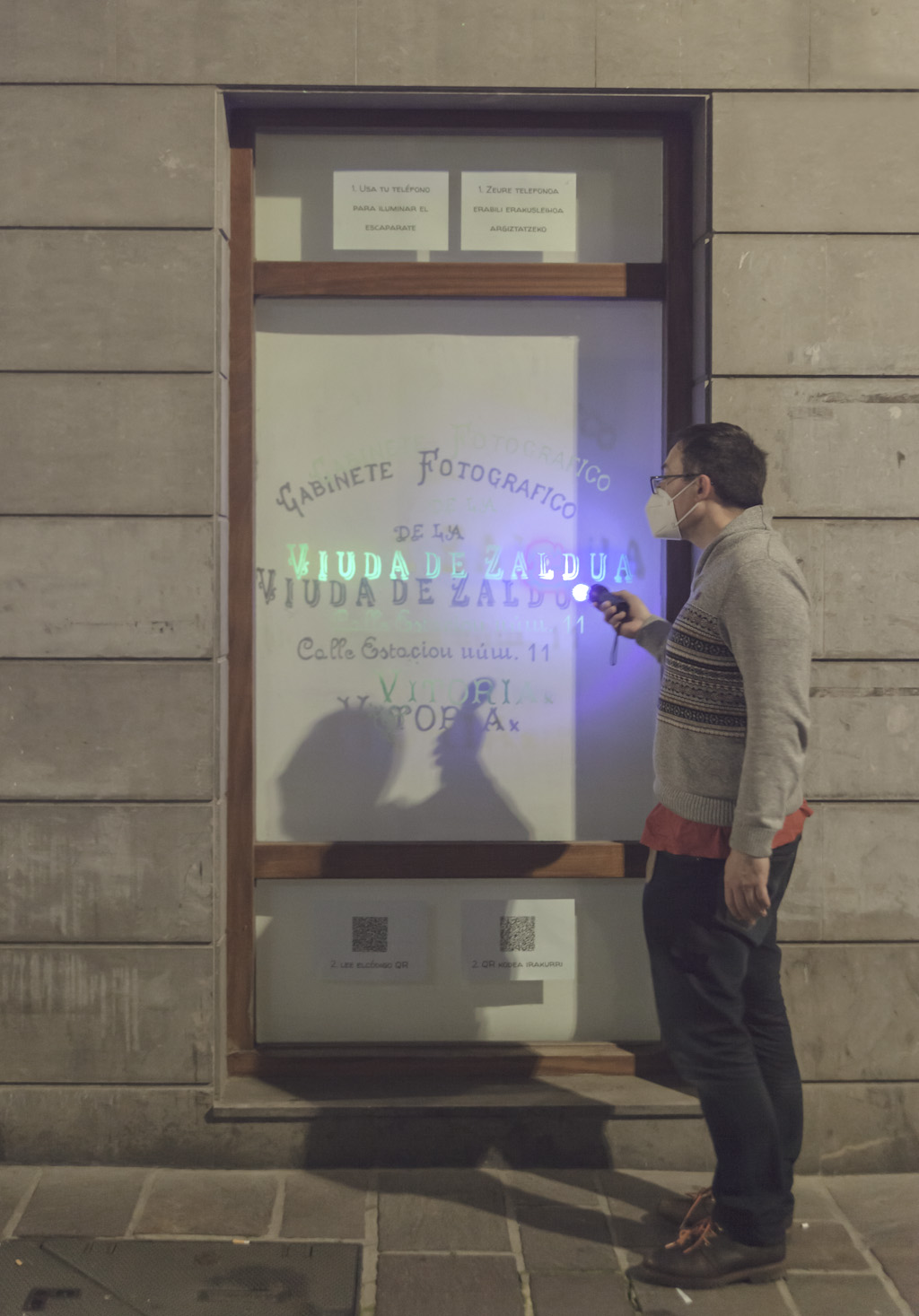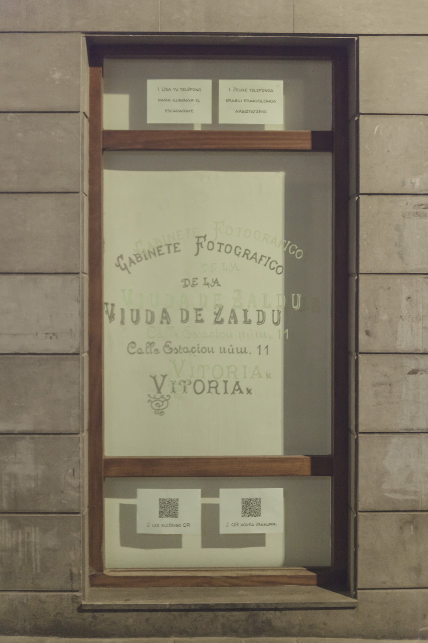 La propuesta consiste en un rótulos realizado con pintura fotolumiscente sobre el escaparate de Zas Kultur, que muestra sobre el cristal la información del Gabinete Fotográfico de la primera fotógrafa profesional de Vitoria-Gasteiz, Basilia Tarrios y Uriondo. La pintura se ilumina con la luz, por lo que se propone (mediante un texto) animar a la gente que pase por fuera del local a activar la pintura usando la luz de sus teléfonos móviles. Una vez vista la publicidad comercial se propone encontrar dónde estaba, buscar un código QR y leerlo.