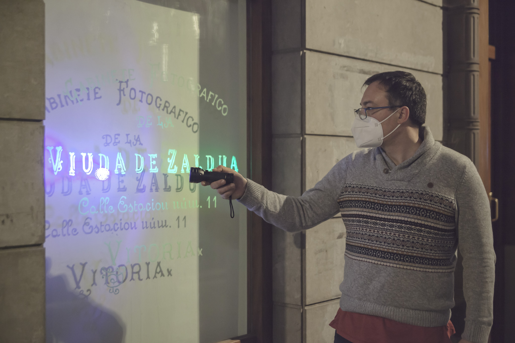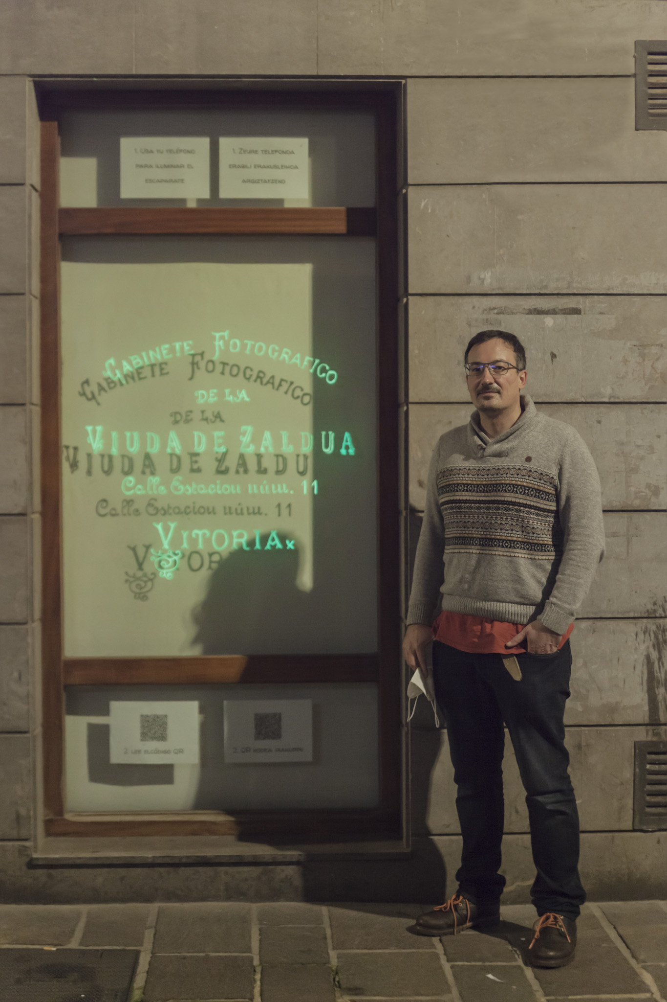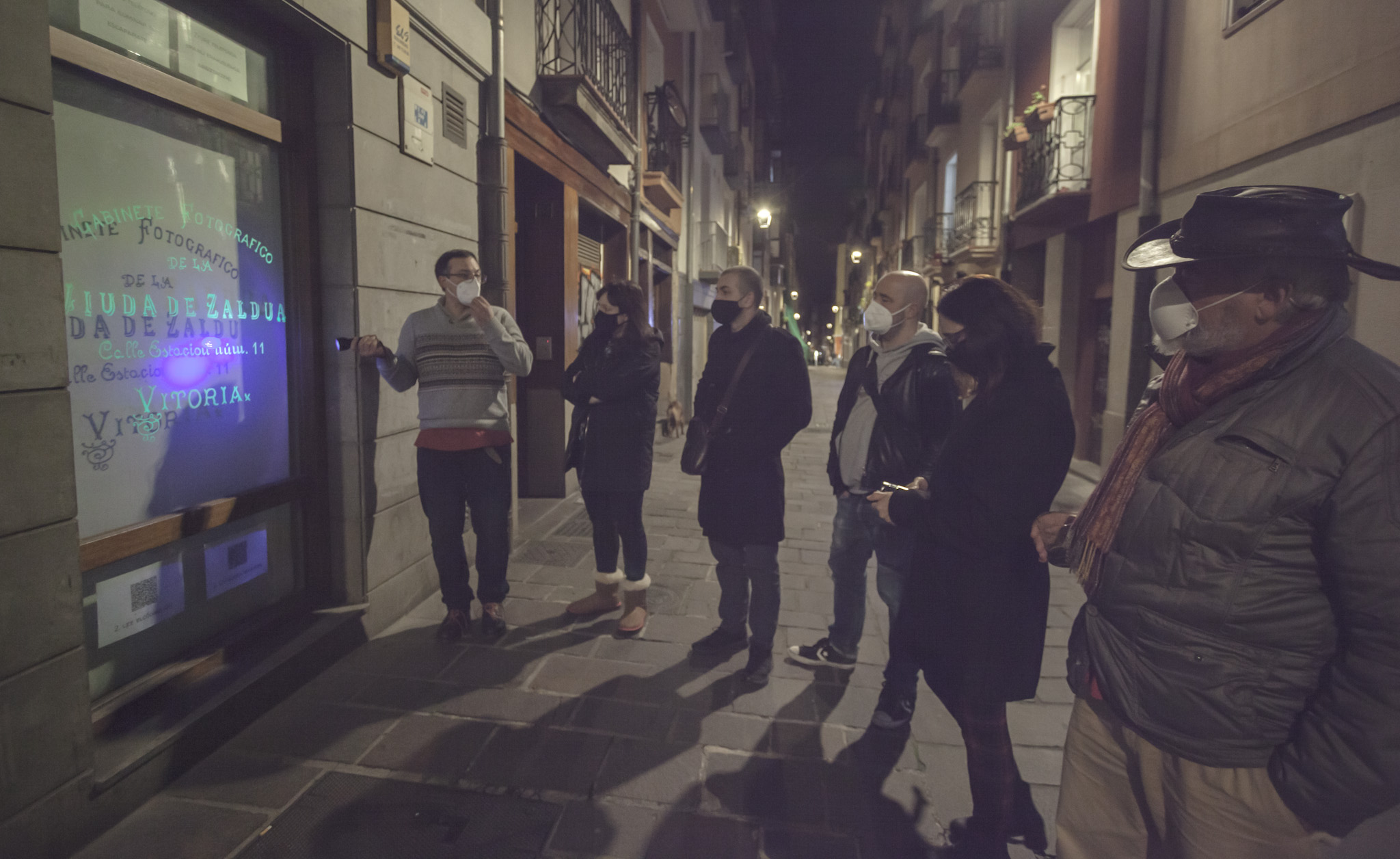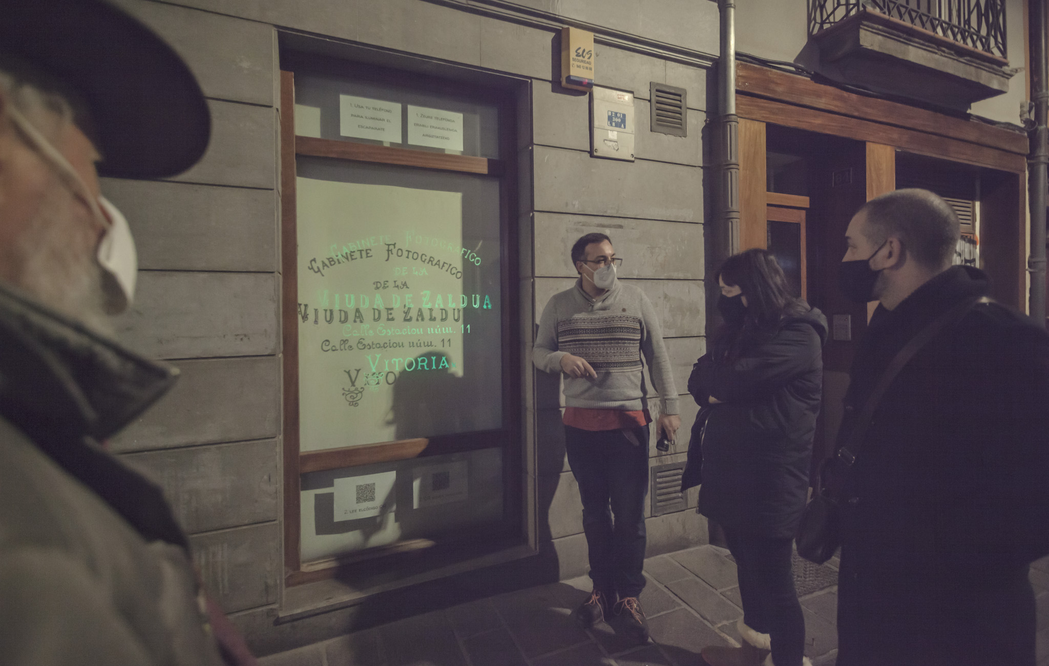 La propuesta consiste en un rótulos realizado con pintura fotolumiscente sobre el escaparate de Zas Kultur, que muestra sobre el cristal la información del Gabinete Fotográfico de la primera fotógrafa profesional de Vitoria-Gasteiz, Basilia Tarrios y Uriondo. La pintura se ilumina con la luz, por lo que se propone (mediante un texto) animar a la gente que pase por fuera del local a activar la pintura usando la luz de sus teléfonos móviles. Una vez vista la publicidad comercial se propone encontrar dónde estaba, buscar un código QR y leerlo.