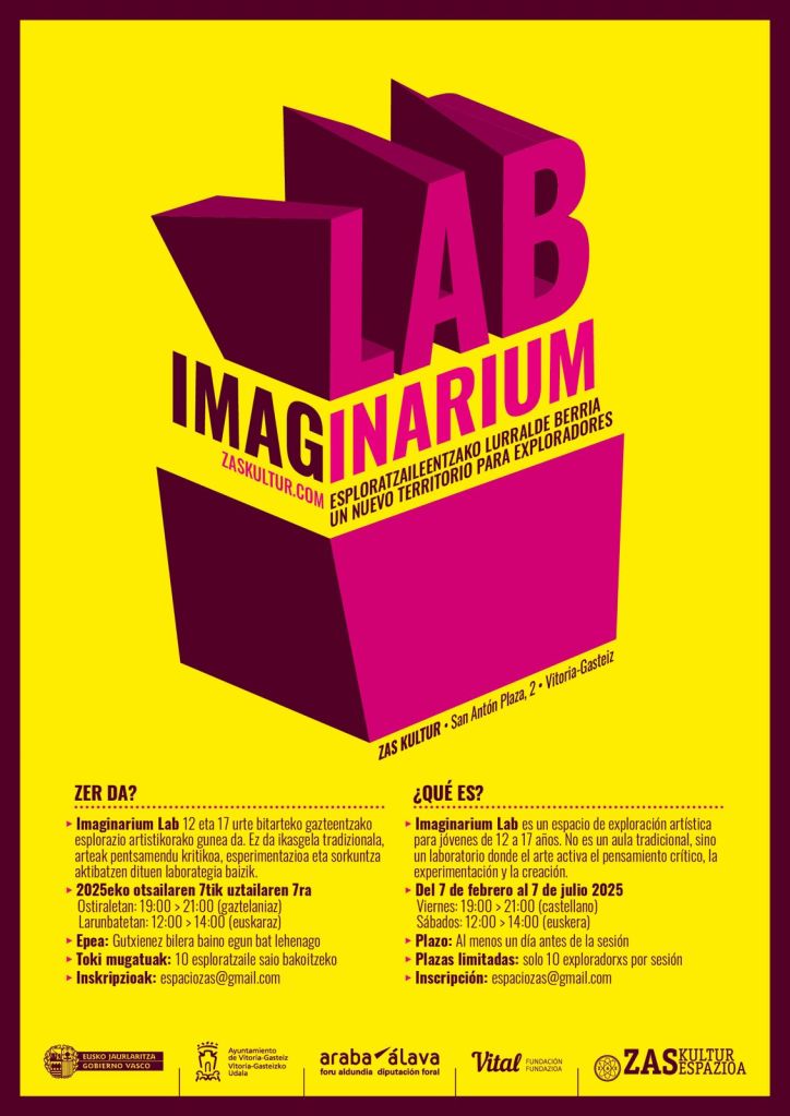 El taller experimental y abierto para jóvenes de 12 a 17 años en Zas Kultur es un espacio diseñado para despertar y canalizar la creatividad de los más jóvenes. Se desarrolla todos los viernes de 19:00 a 21:00 y los sábados de 12:00 a 14:00, durante todo el año, en un entorno accesible, gratuito y sin necesidad de inscripción previa. El taller está guiado por el equipo de Zas Kultur, que acompaña a los jóvenes en la exploración de materiales y técnicas variadas, siempre inspirados en las temáticas y obras presentes en los espacios expositivos.