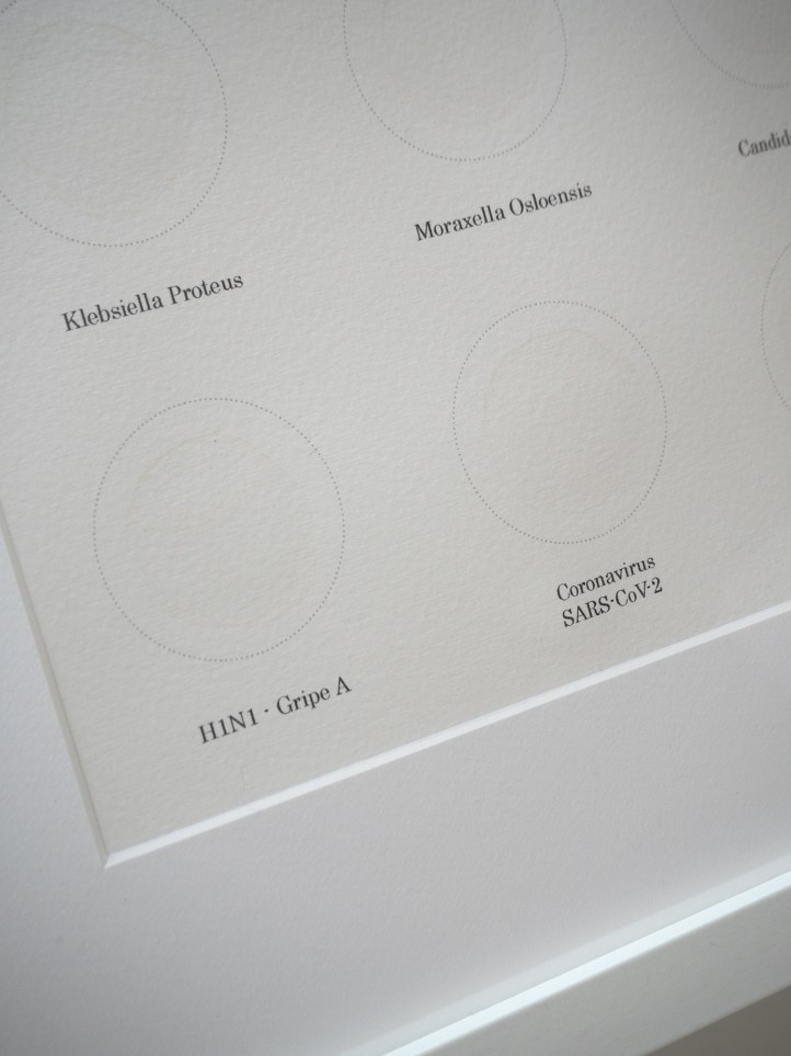 En base a estas premisas, la pieza que propongo se compone de muestras de patógenos invisibles, extendidas sobre una superficie de papel de acuarela, tras haber sido recogidas con un pincel húmedo en el agua de mi paño de cocina, en la pantalla de mi smartphone, y en los guantes que he utilizado para ir al supermercado. Dado que en todos los casos he utilizado el mismo pincel, la presencia de los diferentes patógenos es variable e indeterminada. Dispongo los nombres de los diferentes microorganismos de manera aleatoria, bajo la suposición de que todos o la mayoría de ellos se encuentran presentes en todas las muestras, o en ninguna, con una probabilidad del 50%. Es decir, o están ahí, o no están, o ambas cosas a la vez.
