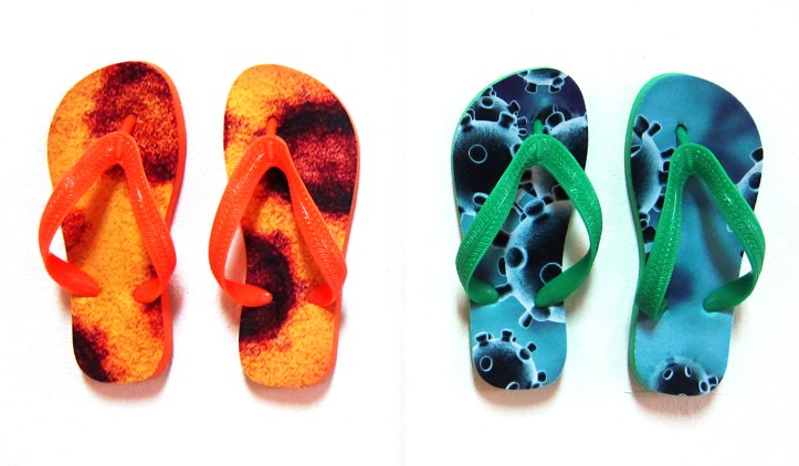 Presentación de la obra por el artista: La belleza de las recreaciones infográficas del coronavirus, realizas mediante renderizados 3D, han inundado los medios de comunicación durante la actual pandemia. Existe una enorme distancia entre el gris referente inicial fotografiado en fríos laboratarios y sus posteriores interpretaciones visuales. El uso de una estética que raya el pop psicodélico suaviza la letal corporalidad microscópica del virus. No parece que exista una intención, un propósito de estetizar la enfermedad. Quizá de lo que se trate, una vez más, es de realizar imágenes que, bajo el copyright, puedan incorporarse al actual mercado. Como estas playeras tapizadas de varias recreaciones del COVID-19 que, mediante el uso de la apropiación, se nos ofrecen como objeto de consumo para turistas que, paradójicamente, estos días están confinados en sus casas.