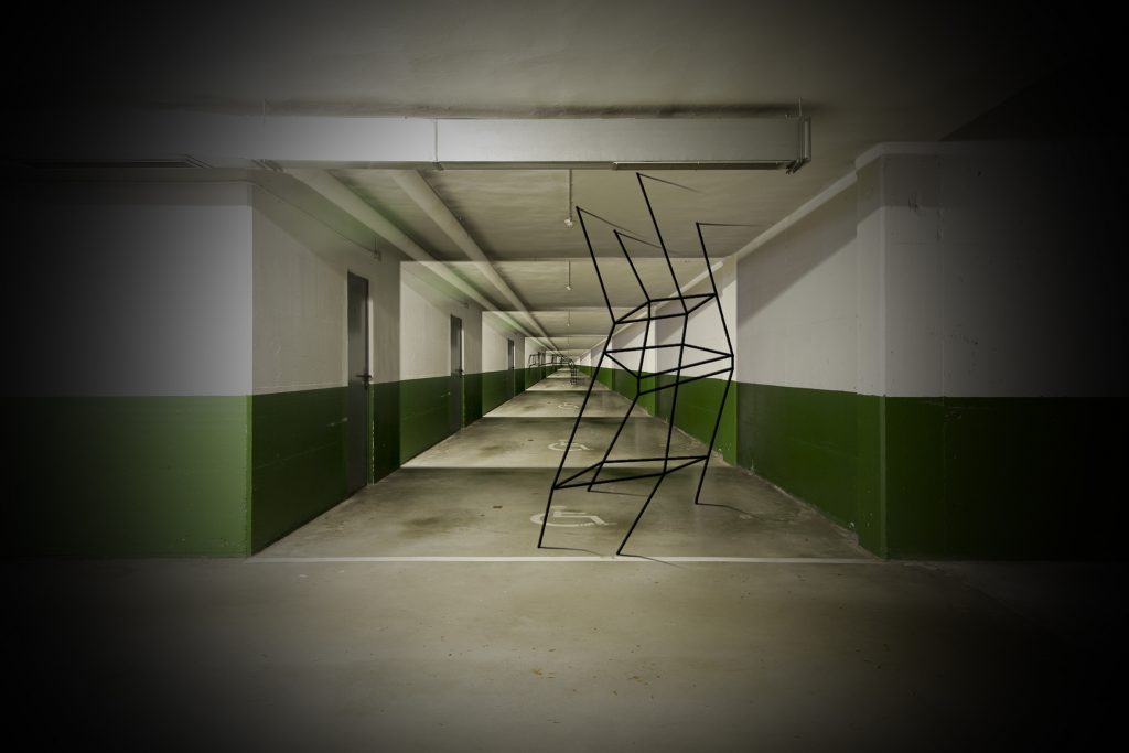 Buscando espacios expositivos, y en su ausencia, imaginándolos. Foto realizada en el garaje de casa, concretamente de la plaza Nº 4. Extrusionada manualmente para ampliar el área aprovechable. En ella se han ubicado dos estructuras de alambre, virtuales. Técnica mixta. Medidas variables.