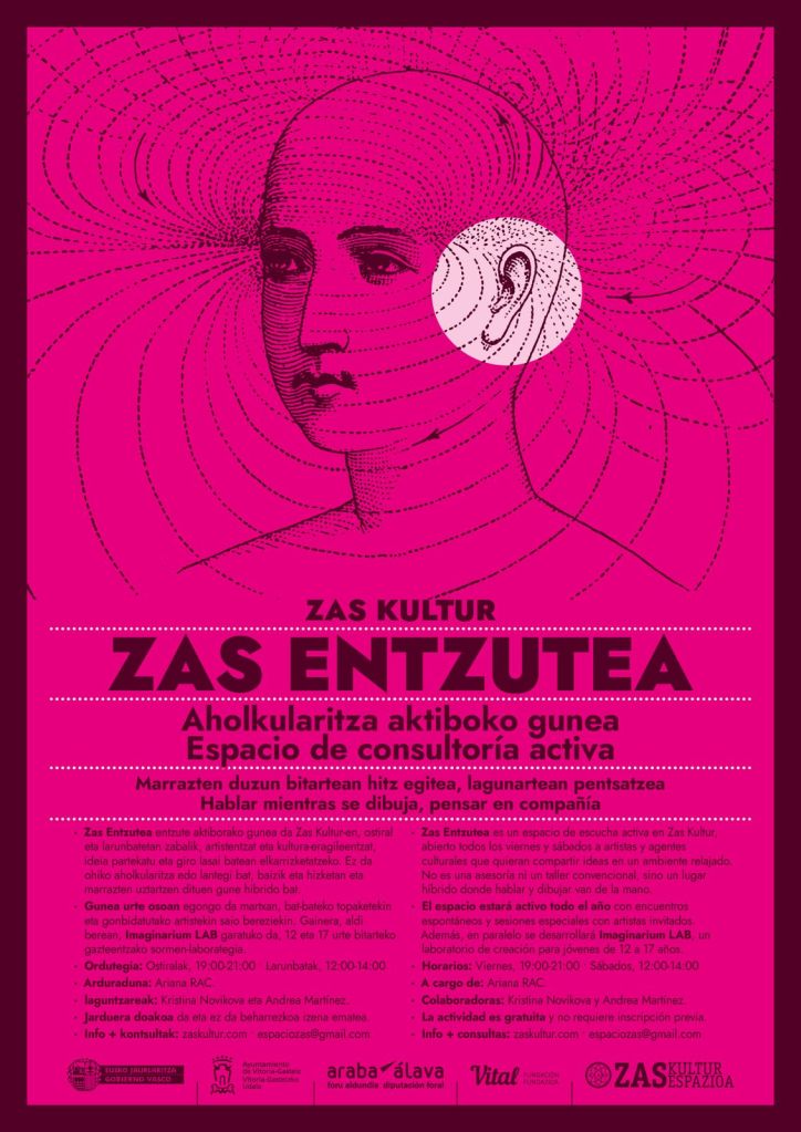 Zas Entzutea entzute aktiborako espazio bat da, apiriletik aurrera Zas Kultur-en izango dena ostiral eta larunbat guztietan. Artista eta kultura-eragileei zuzenduta dago: ideiak partekatu, proiektuak kontrastatu edo, besterik gabe, giro lasaian, irisgarrian eta horizontalean solasean aritzeko.